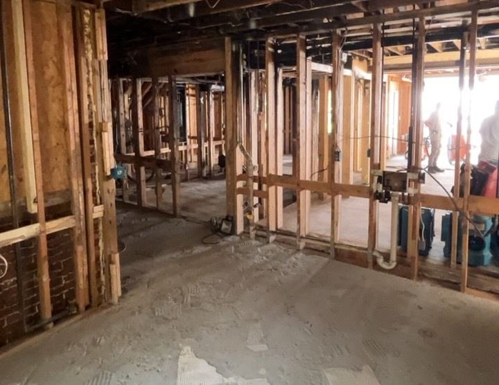 This space was fully demolished due to contamination. Once exposed, the framing and surrounding structural components were thoroughly cleaned to prepare the area for reconstruction.
