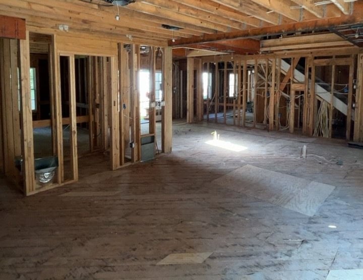 The project required full gut demolition in several areas, careful structural cleaning of preserved rooms, flood cuts to remove trapped moisture, and replacement of any compromised framing.