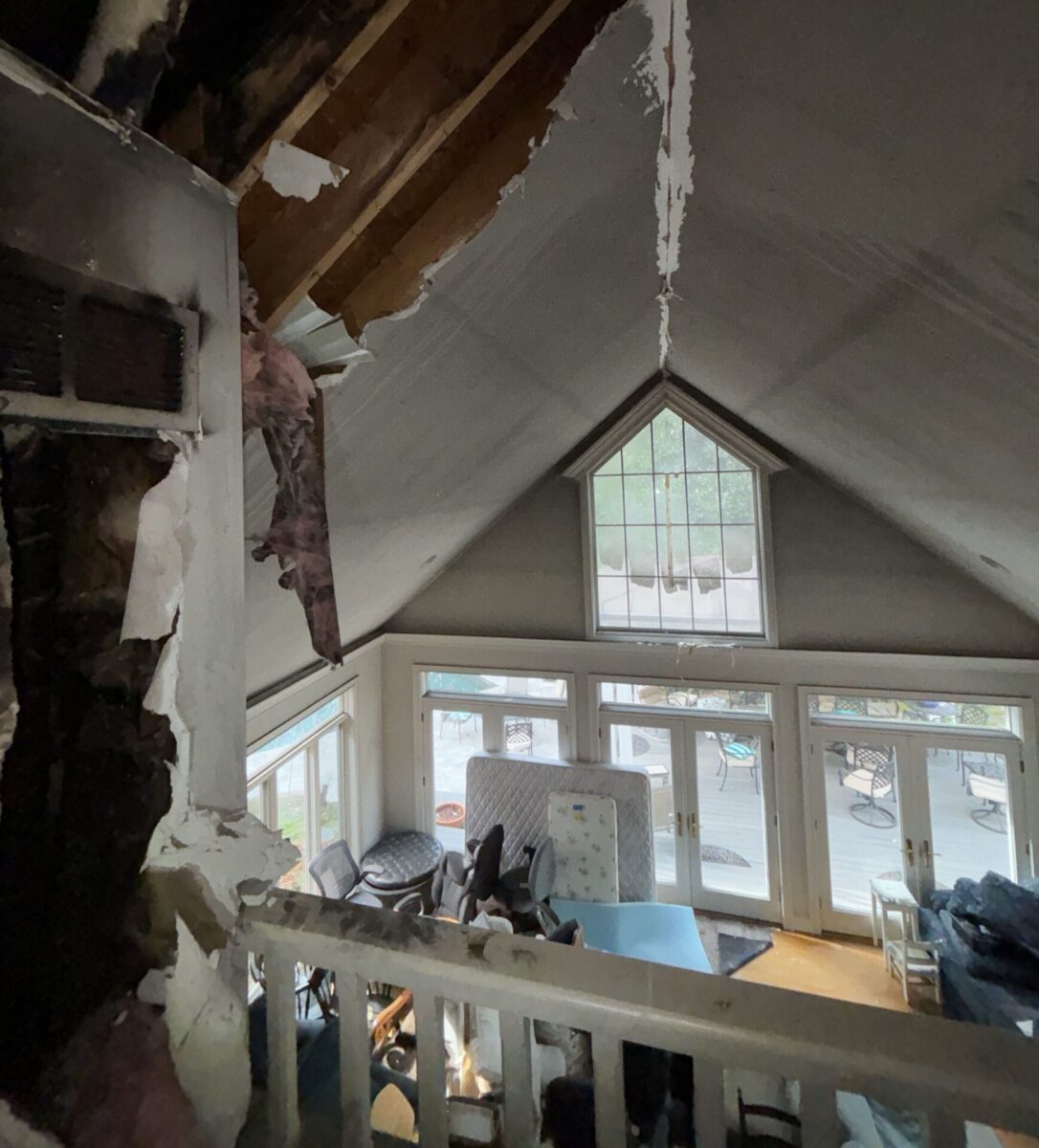 The bonus room required flood cuts and a close evaluation of the tongue-and-groove ceiling to determine how deeply smoke had penetrated. Structural cleaning was completed while carefully documenting conditions in case additional removal became necessary.